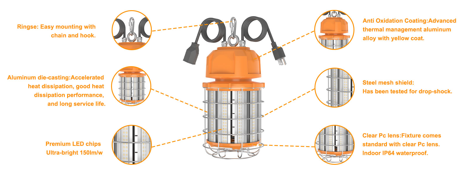 100W Temporary Led Work Lights with Construction String and Linkable plug, New version design, 13000 lumens, replace up to 300w metal halide & high pressure sodium, perfect fixture for Chemical plants, chemical warehouses and some workshops that are prone to flammable and explosive dust, gas, etc.