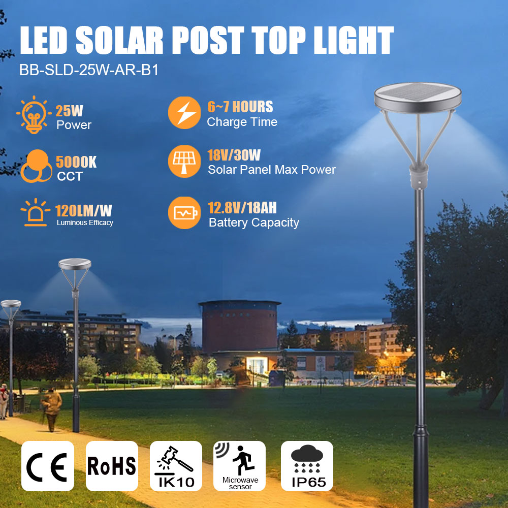 The design of the all in one solar post top light comes from the inspiration and power of the universe, combined the best energy saving parts—solar panel, led lamp and special battery.At the same time, it is very convenient to ship and install. It is one of the best patent products of our company.