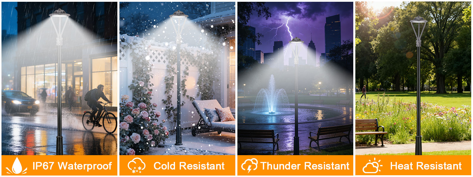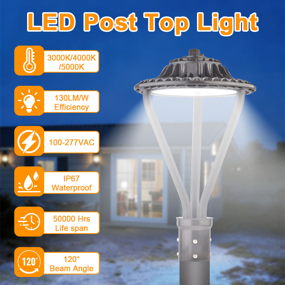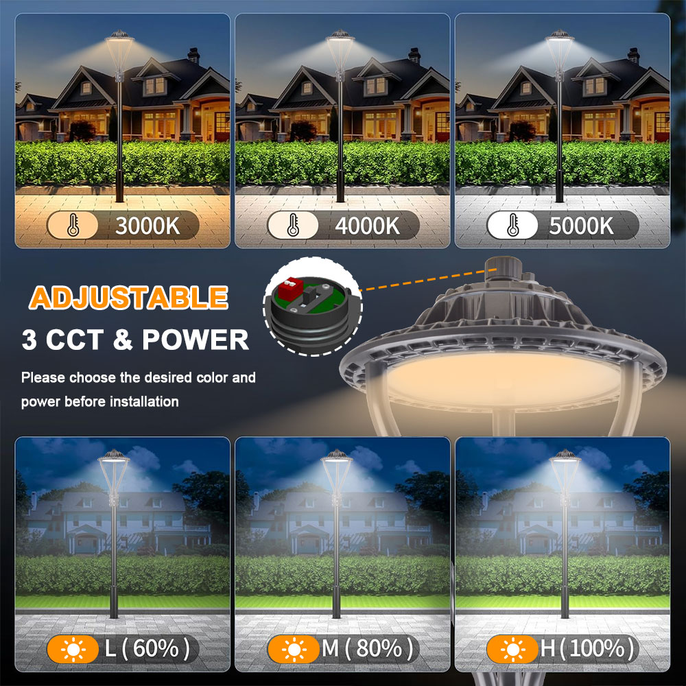 30W-50W-75W Three In One LED Post Top Light with Adjustable Color 3000K-4000K-5000K IP67, 100-277VAC with photocell sensor, has the high-performance lighting solution for the most demanding applications within a unique design.With different precision refractive optical lens and an easy-install design, it can be used in many applications such as pedestrian street,factory,schools garden,courtyad,hotel,parking lot,public parks etc.