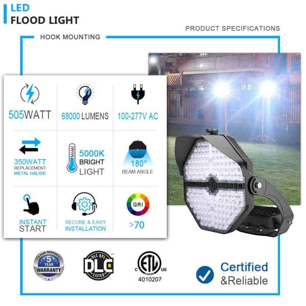 LED Stadium Lamp 505W, it have adopted durable, die-cast aluminum housing with heat dissipating fins,Black polyester powder-coat finish. There are universal 120-277VAC, also we have high voltage of 347-480V AC input voltage available. Standard with 0-10V dimming.