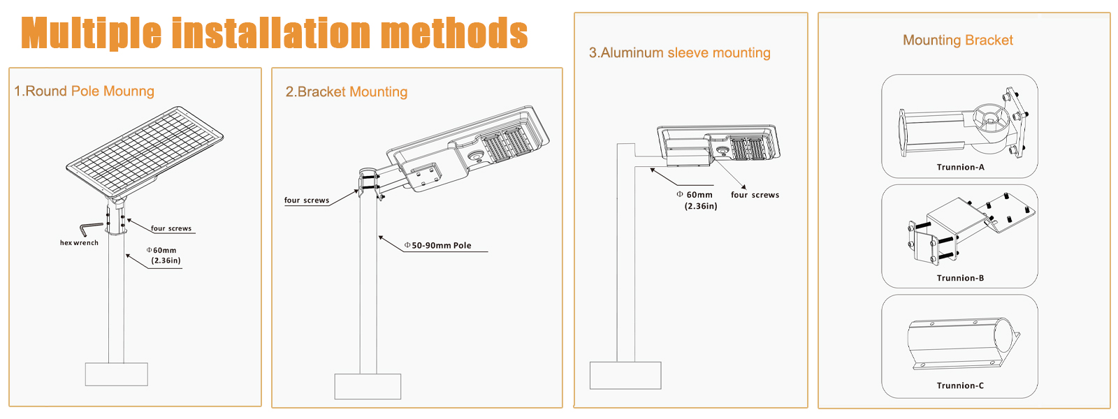 ćEasy to install and save timećYesbulb solar outdoor street light comes with a full set of mounting screws, no need for additional hard-wired chains. Due to a large number of accessories, please unpack in time after receiving the package to check whether they are complete. If it is missed, please do not hesitate to contact us, Yesbulb will reissue it for you ASAP. Save your time, energy, and electricity bills. Both wall and pole mounts are available.